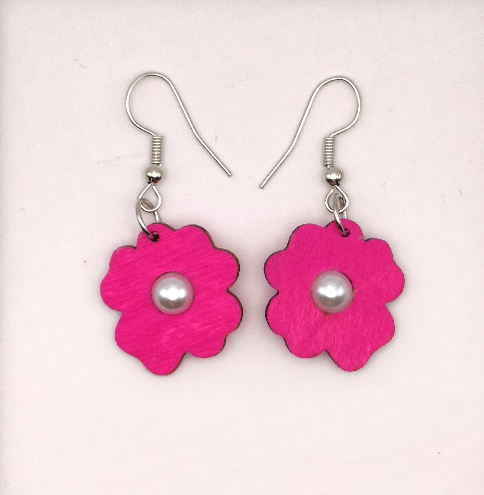 Koivuvanerista laserleikattu ja helmellä varustettu kukka, halk. 20 mm. Allergisoimattomat koukut.