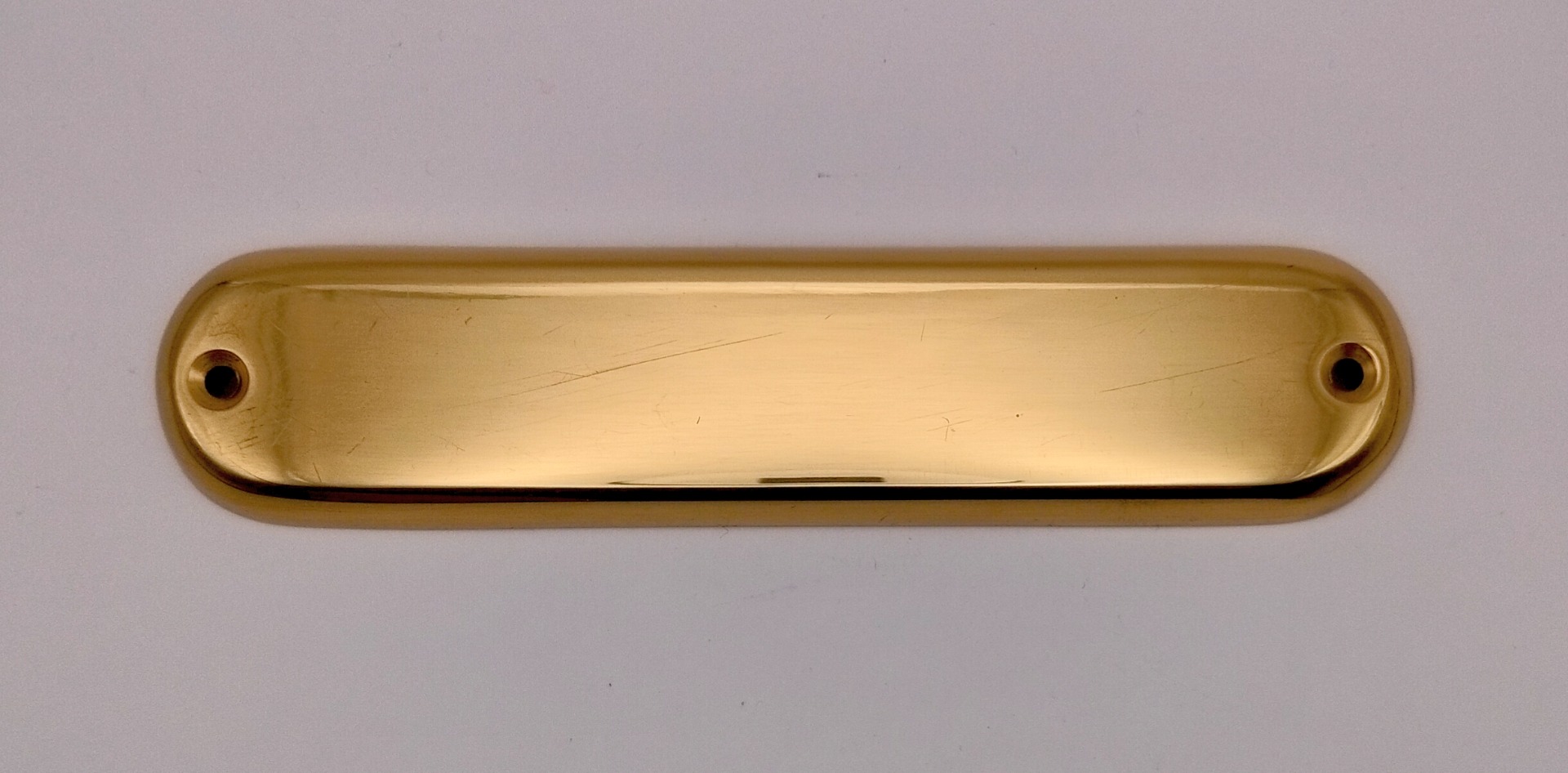 Valettua messinkiä. Koko 35 x 160 mm. Kaiverrus ja kiinnitysruuvit sisältyvät hintaan.