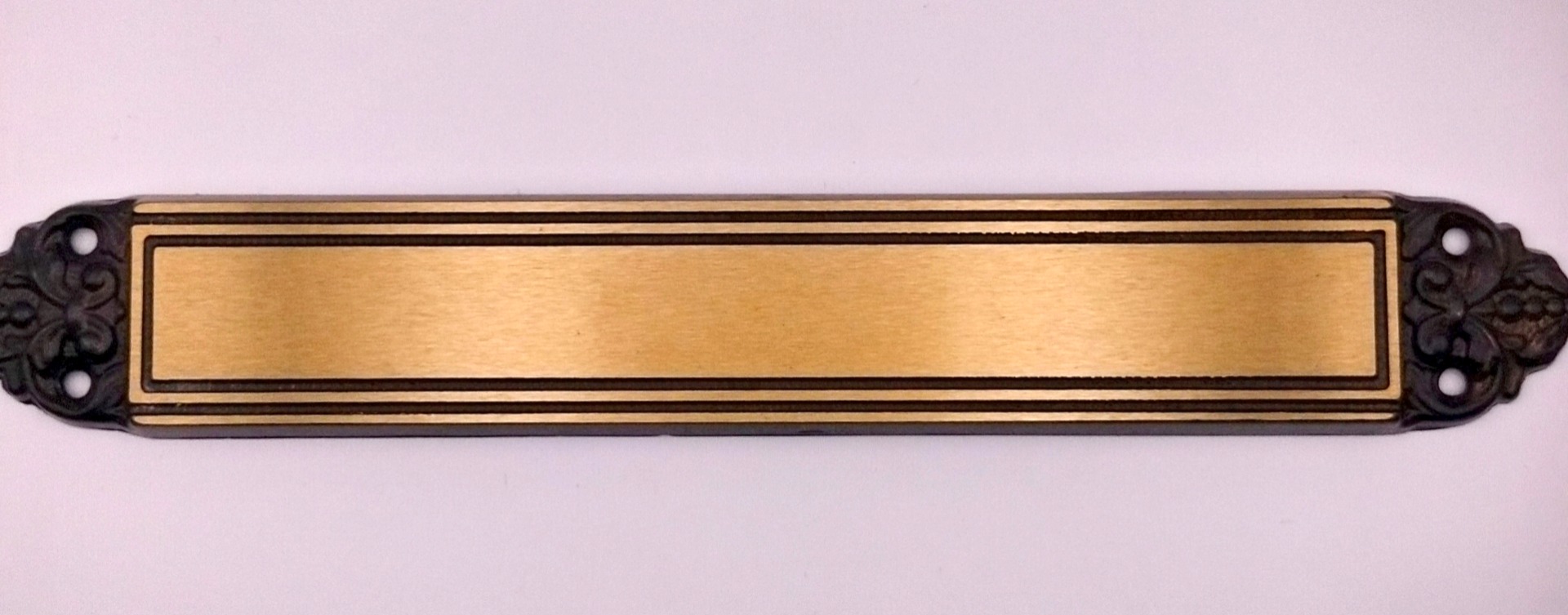 Valettua messinkiä. Koko 35 x 248 mm. Kaiverrus ja kiinnitysruuvit sisältyy hintaan.
