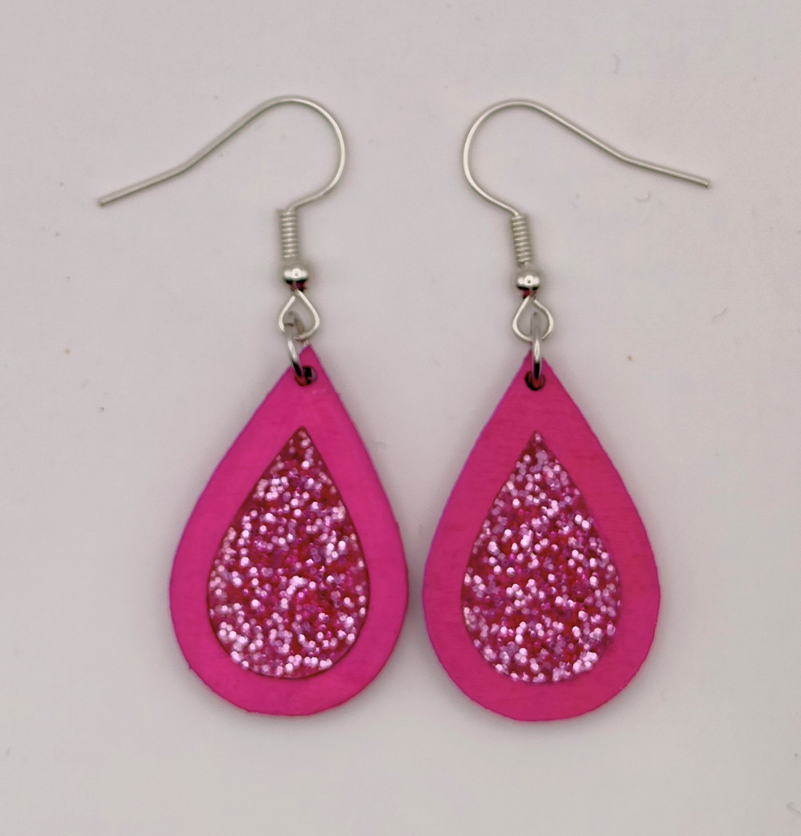 Ulkokehä lehmusvaneria, sisusta glitter-akryyliä. Kokonaiskorkeus n. 50 mm, pisara n. 30 mm. Nikkeli- ja kadmiumvapaat koukut.