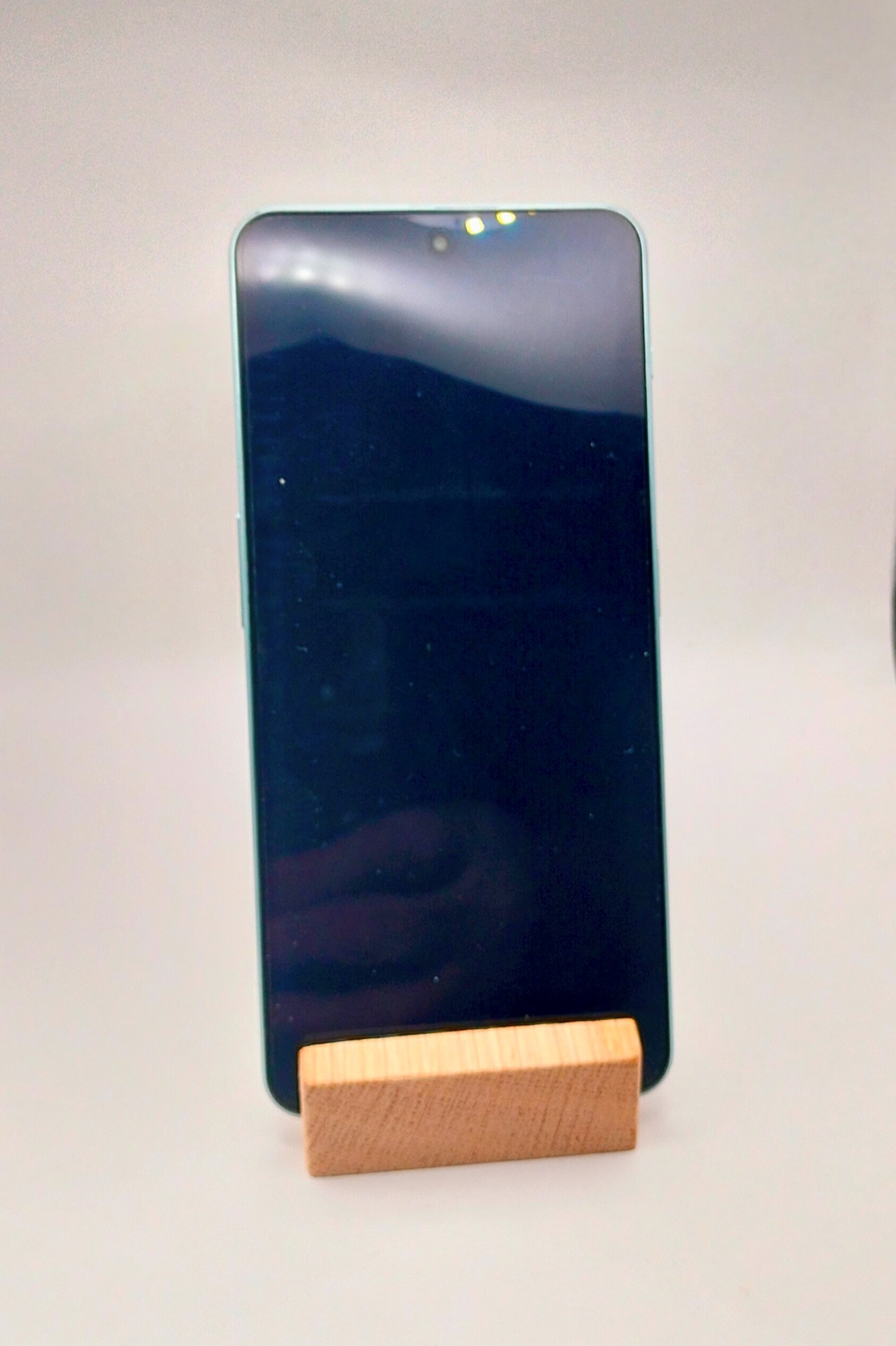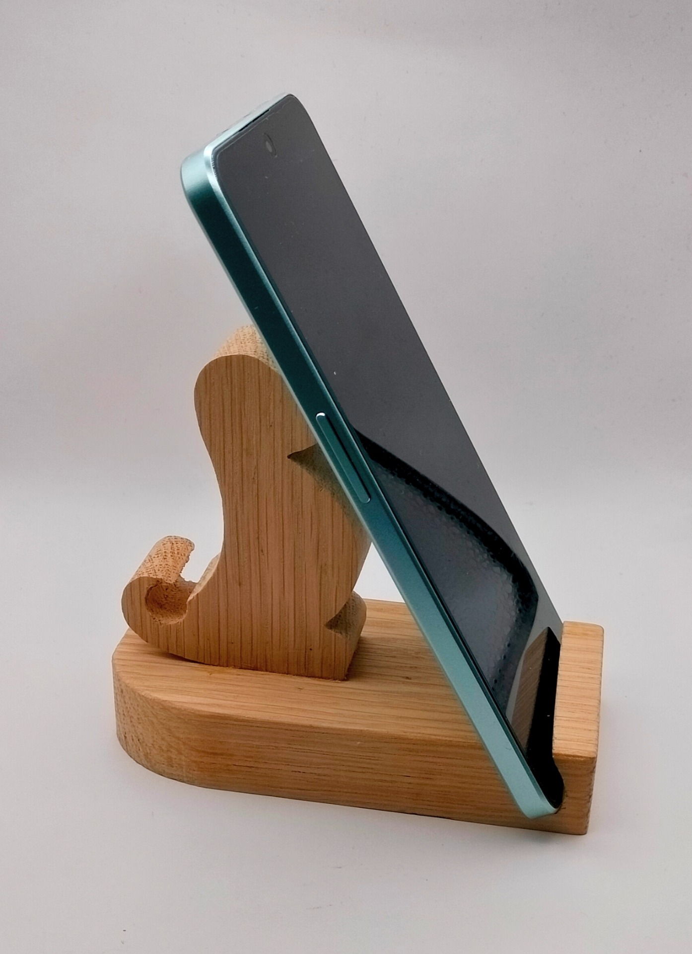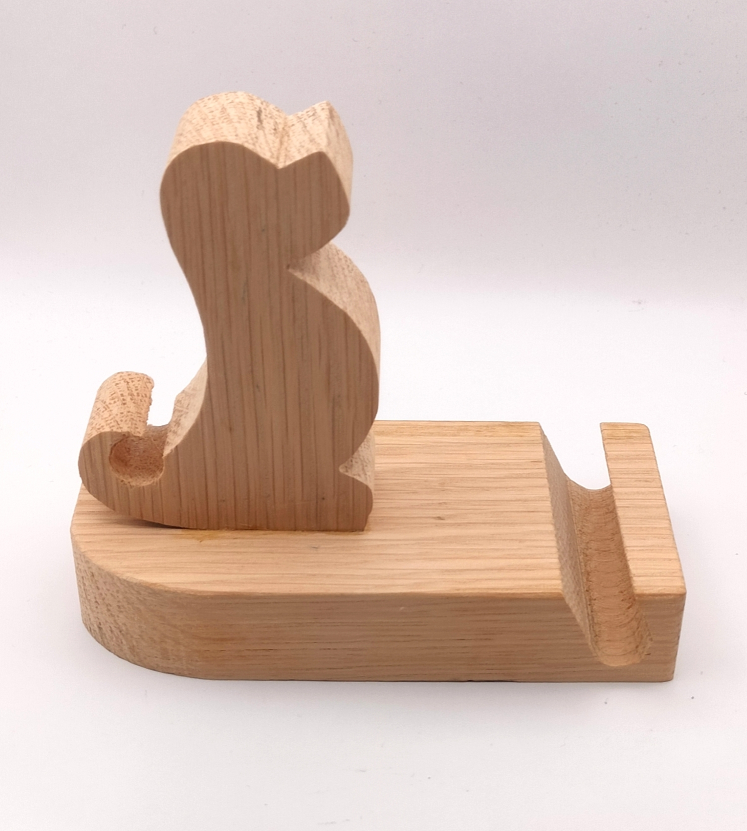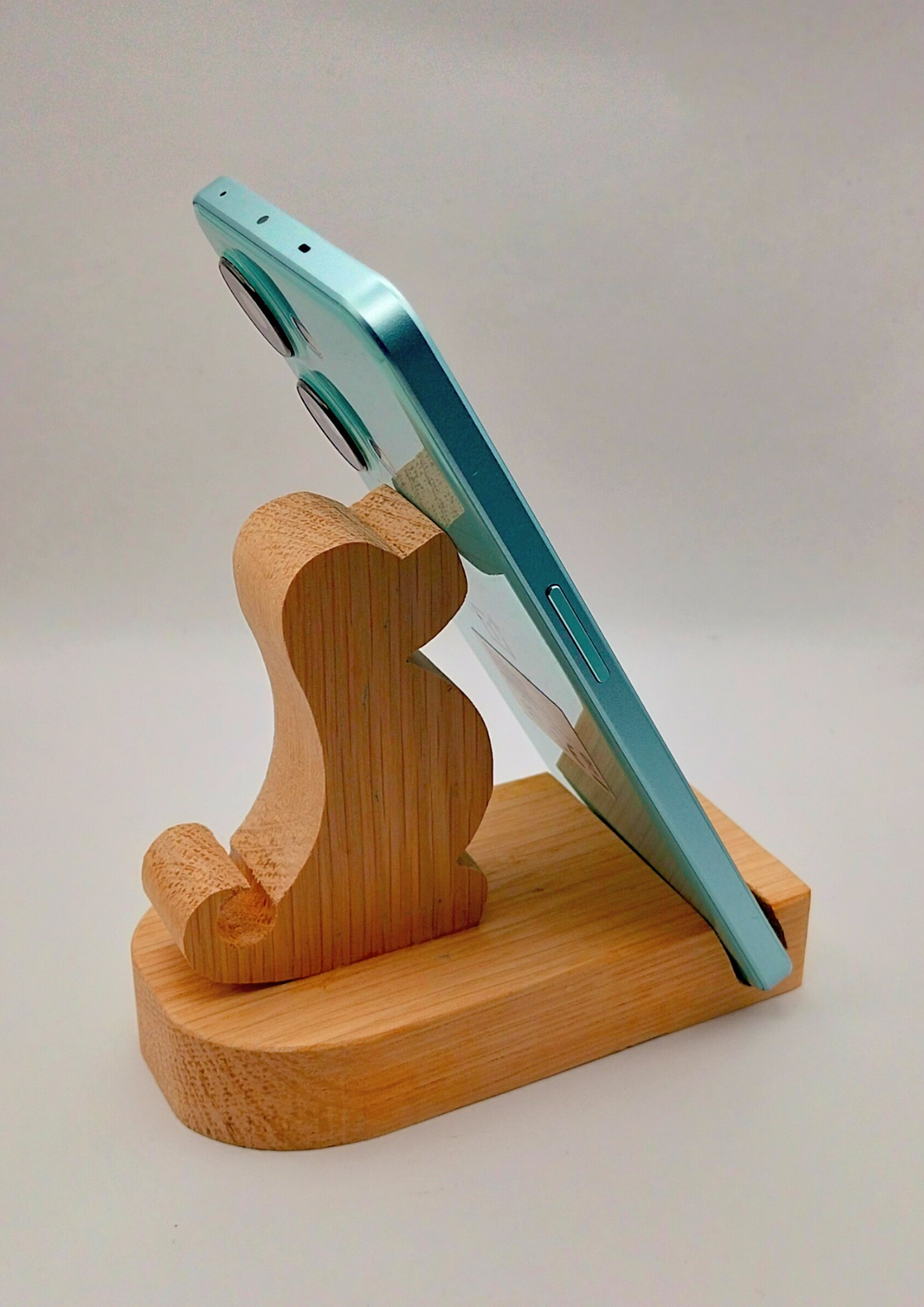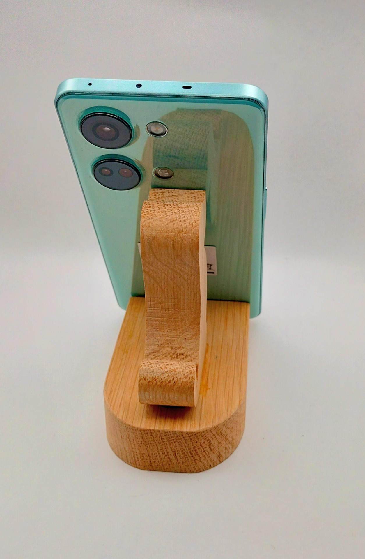 Tammesta valmistettu tukeva matkapuhelinteline pöydälle. Käsittelemätöntä puuta.