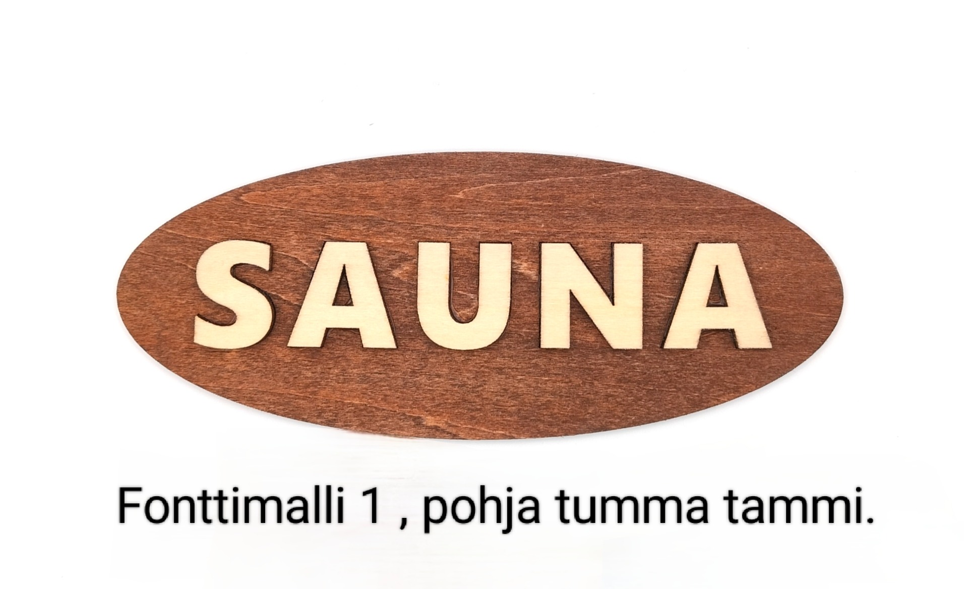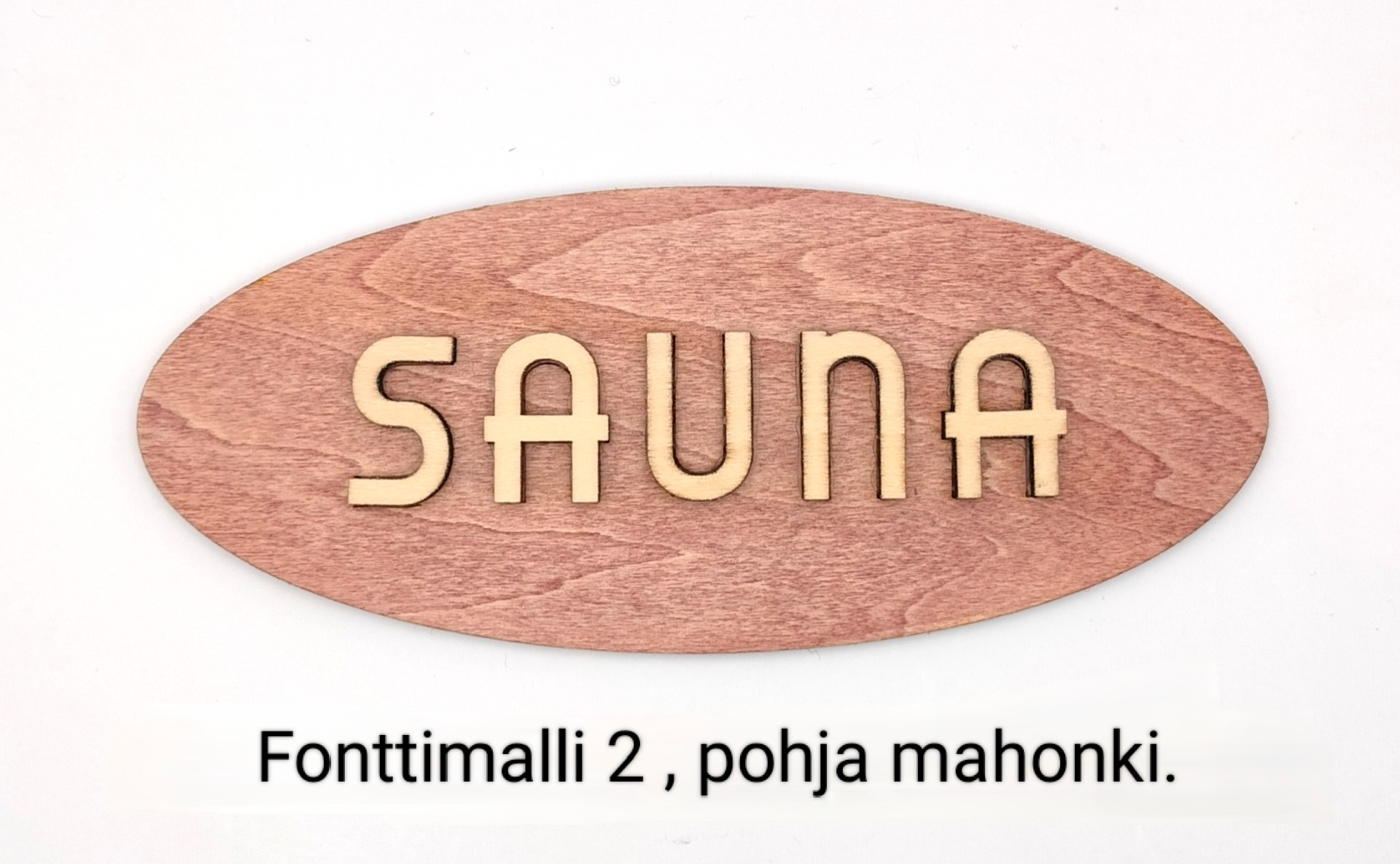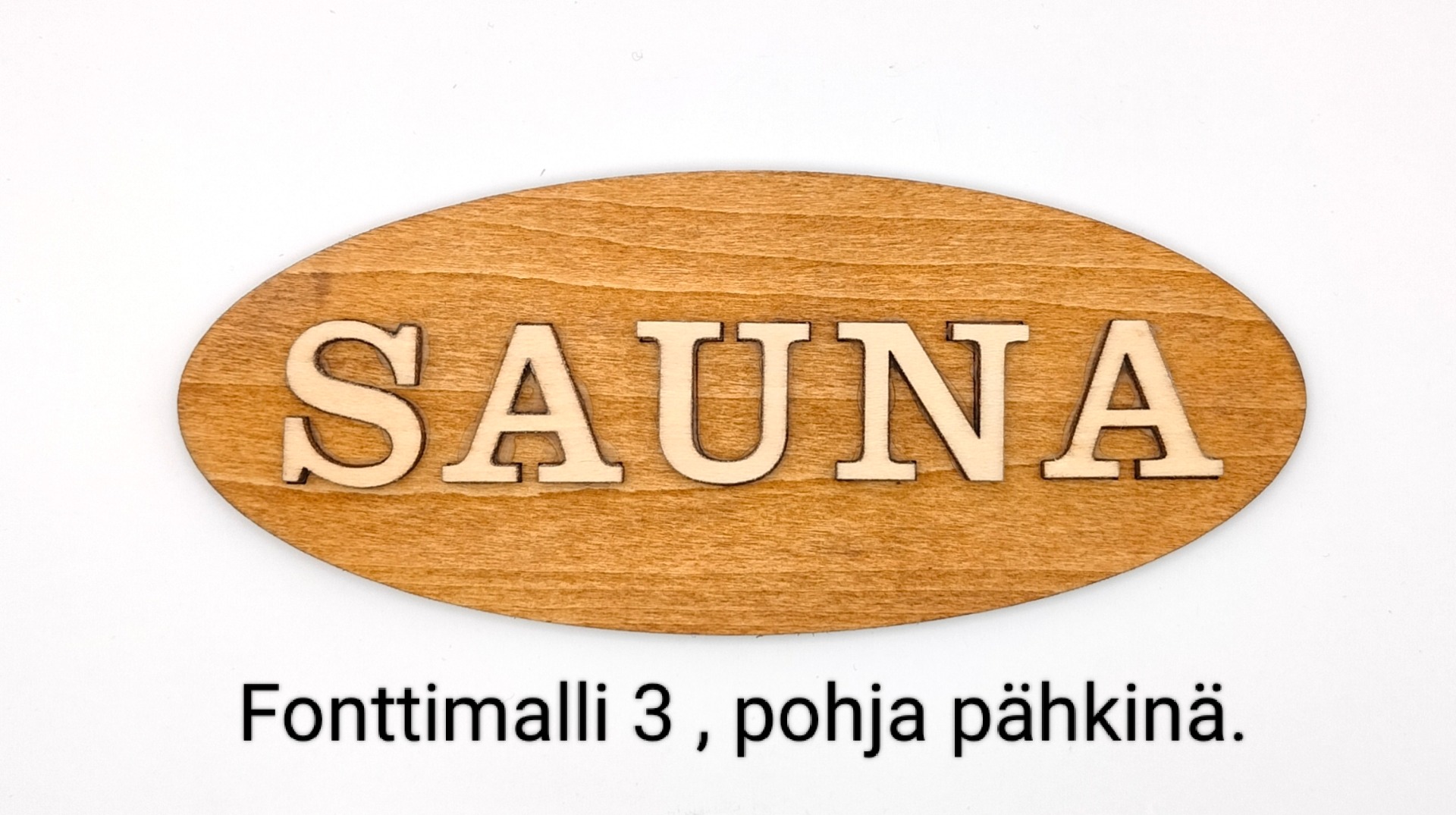 Ovaalin muotoiset SAUNA-kyltit koivu- ja lehmusvaneriata. Taustalla laadukas 3M-teippi kiinnitystä varten, voidaan myös kiinnittää ruuveilla. Kuvissa perusmallit ilman petsiä ja petsattuina. Voidaan myös lakata. Ilmoita tilauksen viestikentässä haluamasi fonttimalli ja pintakäsittely.
